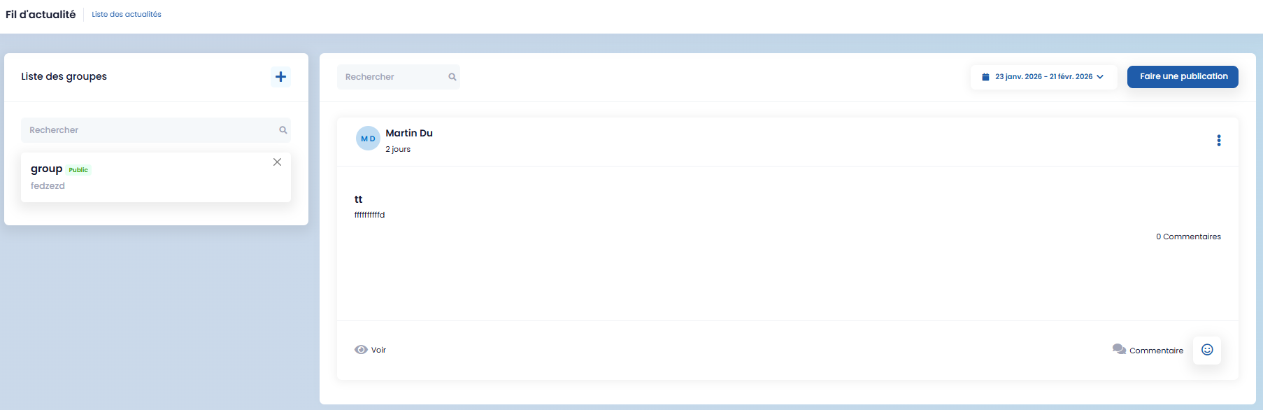 Pour créer une publication, cliquez sur « Faire une publication », remplissez le formulaire, puis enregistrez.