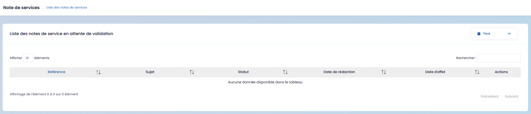 Cette section affiche la liste des notes de service en attente de validation. Vous pouvez les filtrer par période ( aujourd’hui, ce mois,le mois dernier )