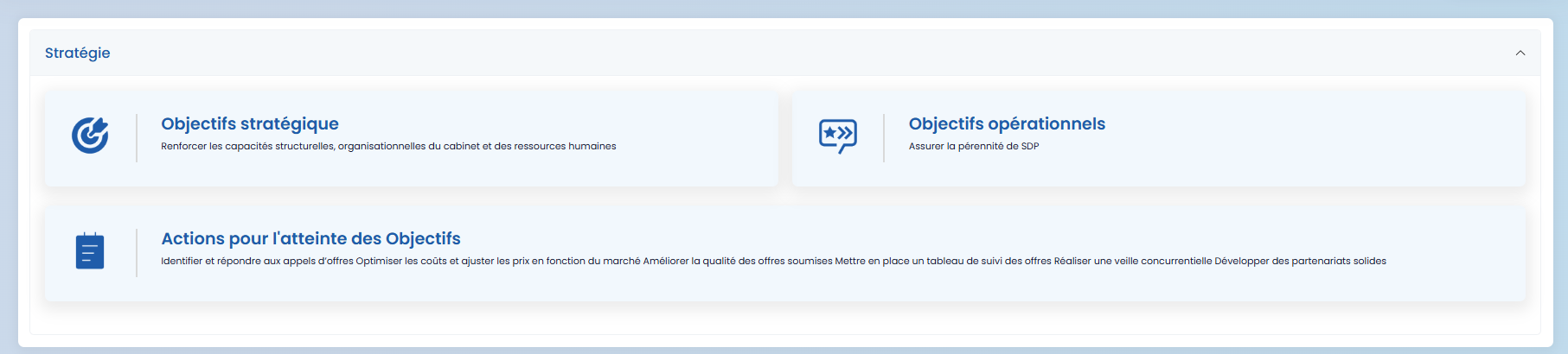 Cette section regroupe vos objectifs stratégiques et opérationnels, ainsi que les actions mises en œuvre pour en assurer l’atteinte. Elle vous permet d’évaluer l’avancement de votre stratégie et de mesurer l’impact des actions engagées au regard des objectifs définis.