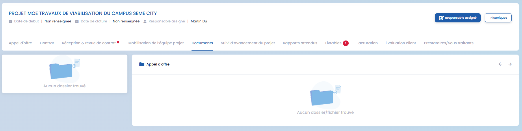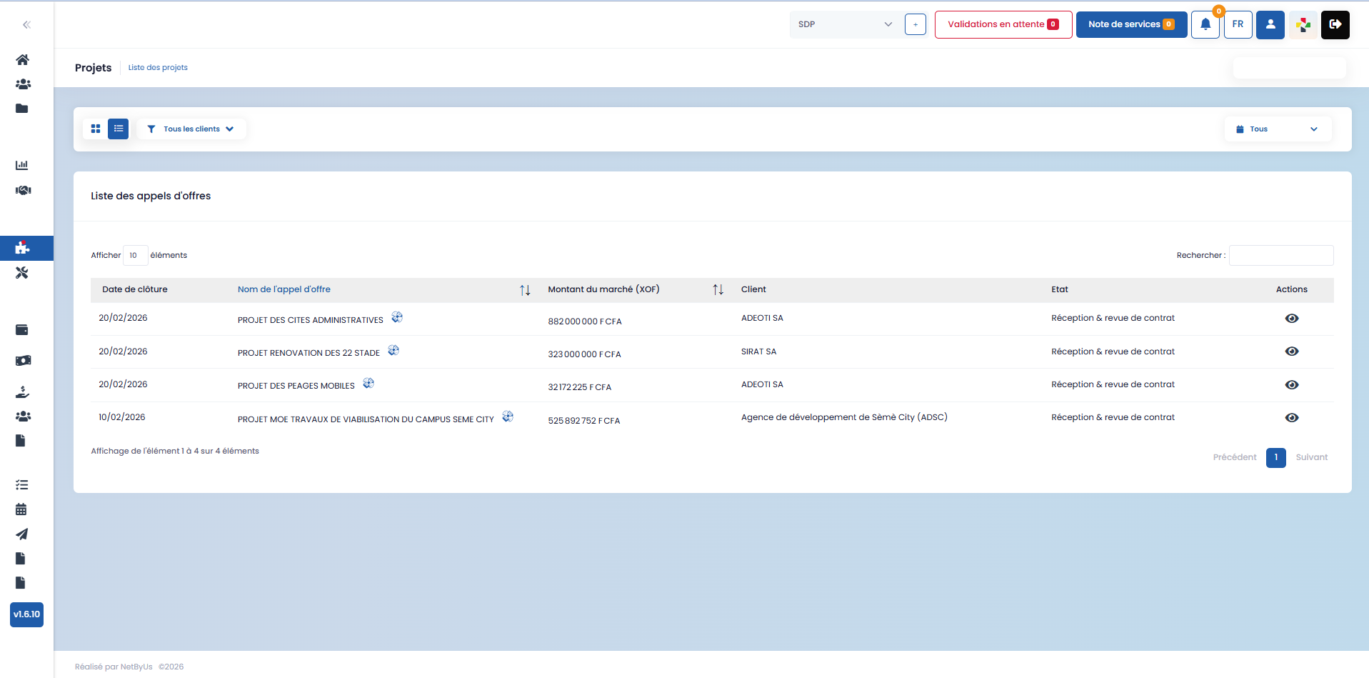 Lorsqu’un appel d’offres est gagné, il passe automatiquement à l’étape suivante dans le module GOP. Un projet lié à cet appel d’offres est alors créé, permettant d’assurer la continuité entre la phase commerciale et la phase opérationnelle.
