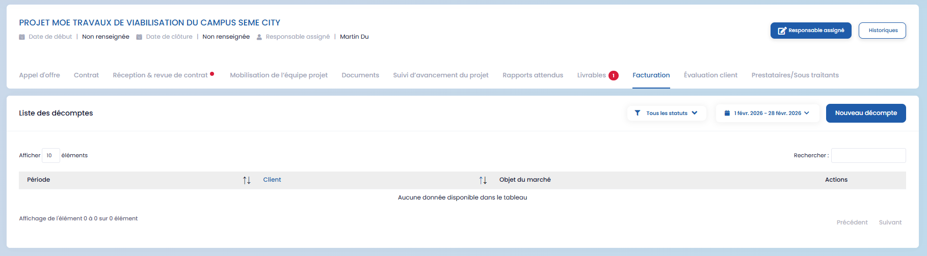 - de filtres permettant d’afficher les projets selon le client ou la période.