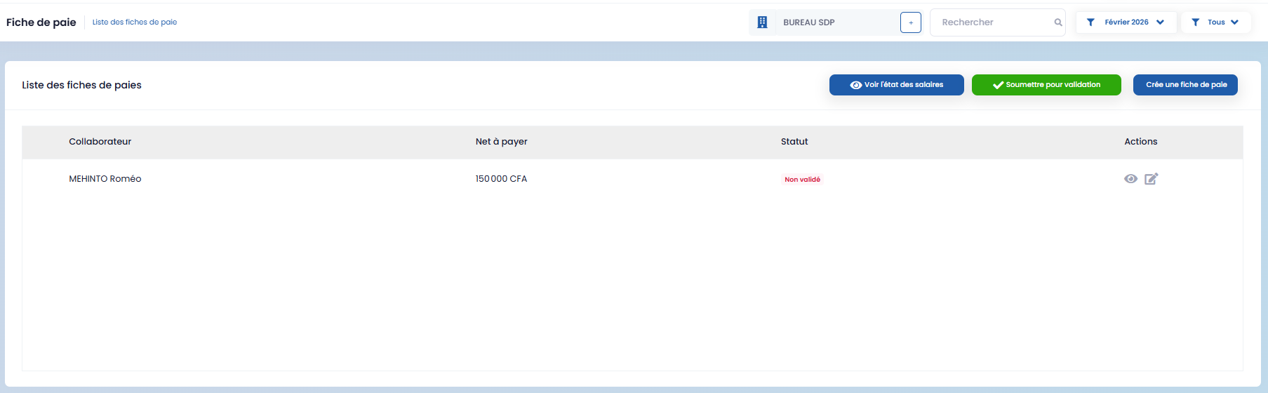 Using the "View payroll status" button, you can consult the status of salaries with a monthly filter.